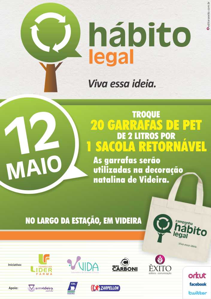 A campanha Hábito Legal é uma iniciativa do Grupo Carboni, Laboratório Vida, Farmácias Lider Farma e Êxito Editora e Comunicação, com apoio dos Supermercados Zarpellon, CDL Videira e site emvideira.com.br, e está também na internet, através das redes sociais Twitter e Facebook e pelo blog habitolegal.blogspot.com