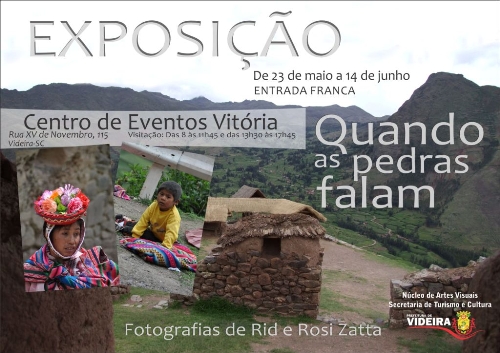 A Secretaria Municipal de Turismo e Cultura de Videira através do Núcleo de Artes Visuais abrem no próximo dia 23 de maio, as 20 horas do CEVI, a exposição "Quando as pedras falam" de Rid e Rosí Zatta. A mostra apresentará um registro fotográfico de uma das viagens do casal ao Peru. Um olhar sobre os mistérios, a cultura e os encantos de uma civilização e sua participação na história da América.