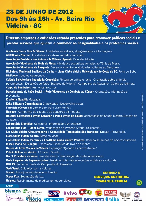 A união entre a iniciativa do Imaculada Conceição e da Êxito, com o fundamental apoio de empresas, instituições, órgãos e entidades da região promoverá um “Dia Solidário” para toda a população de Videira e região, que terá a possibilidade de desfrutar de inúmeros serviços de forma gratuita, interagindo com outras pessoas e se beneficiando com as atividades desenvolvidas, além, é claro, do principal objetivo deste evento que é a solidariedade.