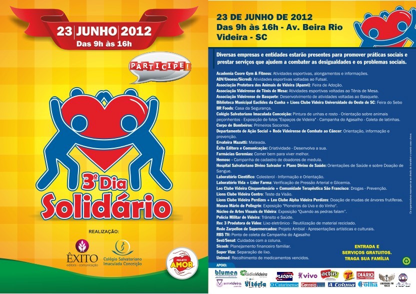Pensando e agindo de modo a ajudar toda a comunidade, o Colégio Salvatoriano Imaculada Conceição e a Êxito Editora e Comunicação promoverão na cidade de Videira o 3º Dia Solidário. O evento acontecerá na avenida Beira Rio, no dia 23 de junho de 2012, das 9 às 16 horas.