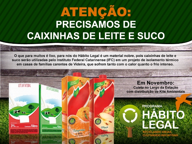 O Hábito Legal está preparando uma nova ação sustentável, dessa vez com o foco na arrecadação de caixinhas de leite ou suco de 1 litro ou mais, e distribuição de ‘kits ambientais’ (em definição). Cada 15 caixinhas entregues nas ações da direito a um kit identificado com a marca do programa.