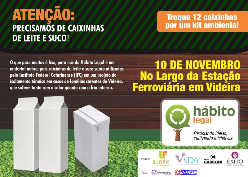 O Hábito Legal preparou uma nova ação de sustentabilidade. Desta vez em parceria com o Instituto Federal de Educação, Ciência e Tecnologia Catarinense (IFC), o foco está na arrecadação de caixas de leite ou suco de 1 litro ou mais que serão utilizadas para fazer isolamento térmico em residências de famílias carentes do Bairro Vila Verde. A população pode participar do projeto trocando 12 caixas Tetra Pak por 1 kit ambiental na ação de recolhimento do dia 10 de novembro, das 9 às 15 horas, no Largo da Estação em Videira.