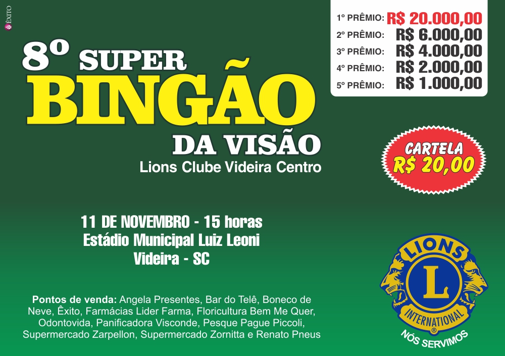 A promoção do Lions Clube Videira Centro entra em sua 8ª edição e dará R$ 33.000,00 em prêmios. A renda arrecadada será destinada à Campanha da Visão, que atende crianças em idade escolar que frequentam as escolas publicas do município.