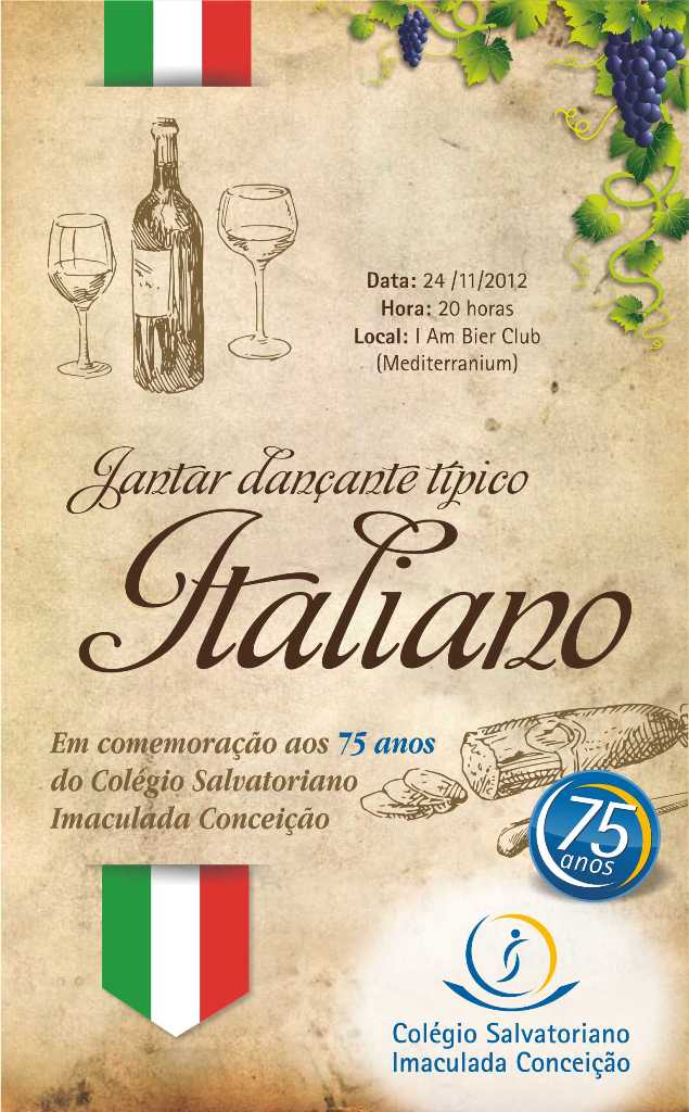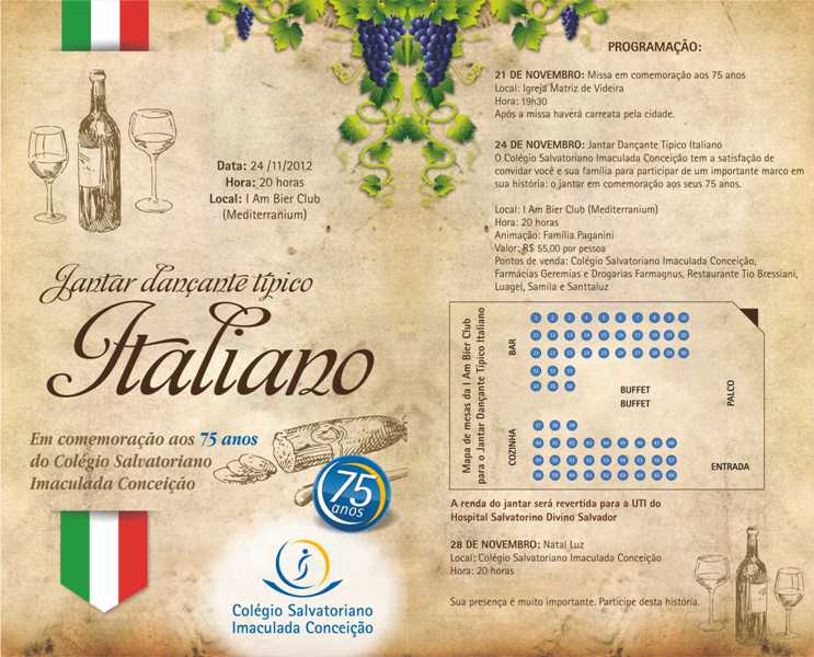 No sábado seguinte, dia 24, a família do Colégio Salvatoriano Imaculada Conceição aguarda a todos para brindar os seus 75 anos com muito estilo em um Jantar Dançante Típico Italiano, na I Am Bier Club, com animação da Família Paganini. Segundo a vice-diretora do Colégio, Irmã Noemi Berlanda, os educadores da instituição têm como missão a formação integral dos alunos e para isso mantêm um contato direto com as famílias. “A decisão de fazer um jantar dançante para envolver as famílias está de acordo com o nosso fazer pedagógico, que tem na família uma parte fundamental. Esta é uma forma de retribuir a confiança que os pais têm em nosso trabalho”, destaca Noemi. Os ingressos para o jantar serão comercializados nos pontos de venda identificados (Farmácias Geremias, Luagel, Restaurante Tio Bressiani, Samila e Santtaluz) e na secretaria do Colégio.