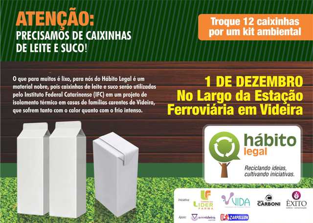 Essa é a segunda ação realizada pelo Hábito Legal em parceria com o IFC, no primeiro evento, em 11/11, foram arrecadadas mais de oito mil caixinhas Tetra Pak, número que surpreendeu os organizadores que objetivavam apenas 3 mil caixinhas. Para esse evento o grupo espera o montante de nove mil caixinhas.