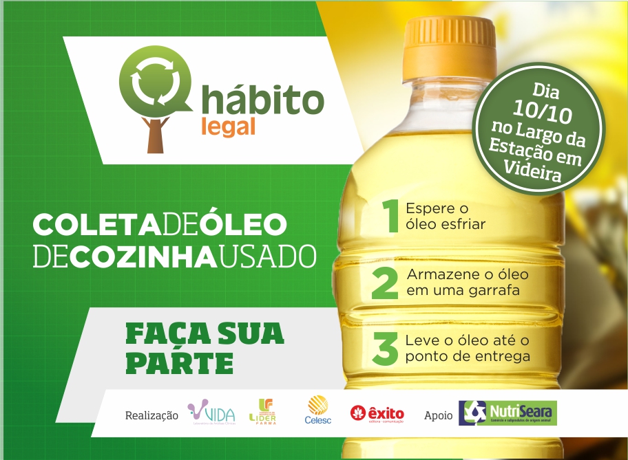 Para evitar que o seu óleo contamine a água e o solo ao jogá-lo no ralo ou lixeiro, a Campanha Hábito Legal promove uma nova ação de coleta de óleo vegetal domiciliar no dia 10 de outubro, das 9 às 15 horas. A ação acontecerá no Largo da Estação Ferroviária em Videira.